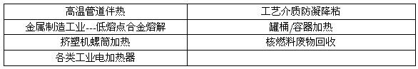 主要用途:高温管道伴热;金属制造工业---低熔点合金熔解;挤塑机螺筒加热;各类工业电加热器